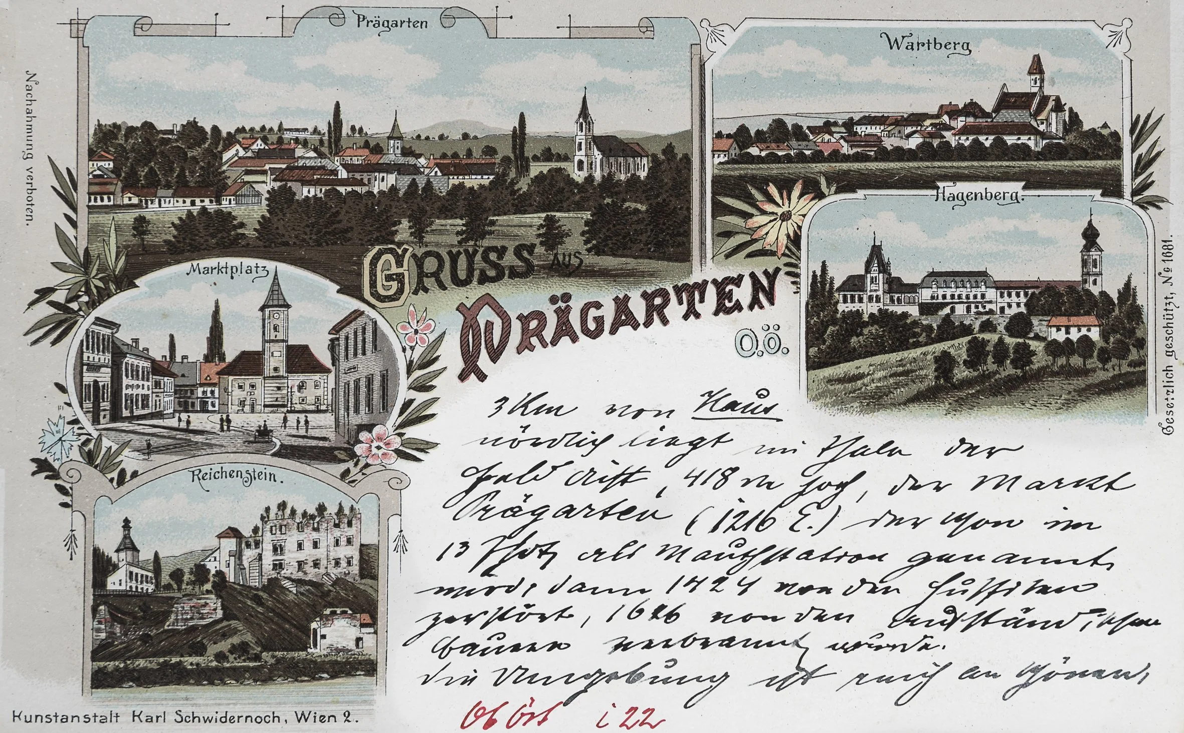 Eine besonders interessante Correspondenz-Karte der Kunstanstalt Karl Schwidernoch aus Wien, mit Bildern von Prägarten, Wartberg, Hagenberg und Reichenstein.